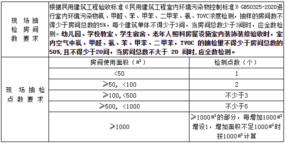 民用建筑工程验收时,室内环境污染物浓度现场检测点应距房间地面高度0.8m~1.5m,距房间内墙面不应小于0.5m,检测点应均匀分布,且应避开通风道和通风口。  ● 检测项目布点位置: